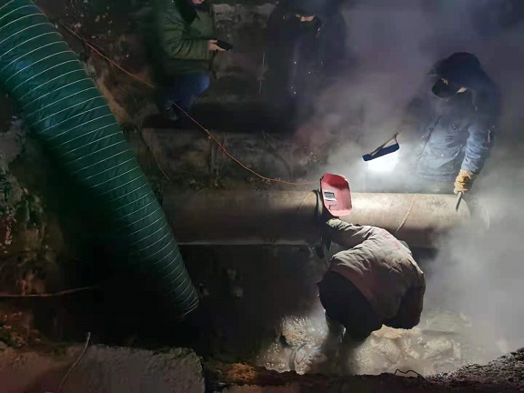 如果關閉閥門,會影響周邊正常供暖,因此,我們選擇了帶壓搶修、頂水作業,該方案需要對高溫高壓水采取導流、防濺措施,也要克服管道高壓對焊接工藝的高要求,雖然難度大,安全作業要求高,但不影響用戶供暖!劉強說,