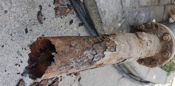 筆者用腳稍微用力踩了一下從地溝拆除出的腐蝕嚴(yán)重管道,一片片鐵銹渣渣就掉了下來(lái)。