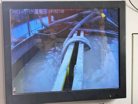 在頂管操作室,可以從電子顯示屏上清晰看到井底施工的畫面,狹窄的空間里兩名個人不停的用鐵鍬將設備挖出的沙土推到水里混合。
