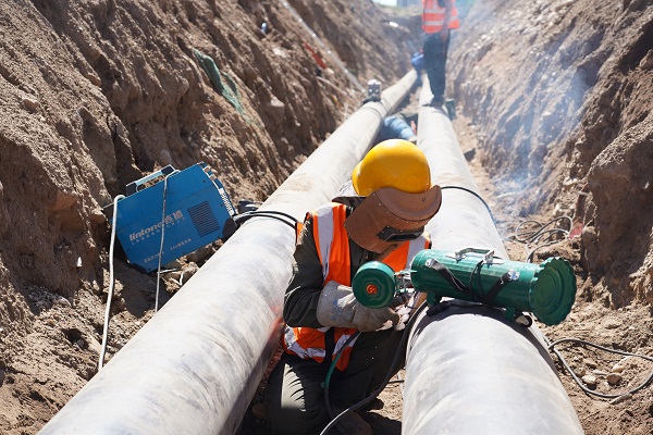 一個(gè)工人師傅,側(cè)身躺在兩個(gè)管道中間的狹小夾縫中,對(duì)管道進(jìn)行焊接。施工單位天津管道公司的段步雨向筆者介紹,"現(xiàn)在這個(gè)師傅做的是第二道工序,叫電焊造面。你看到這么長(zhǎng)的管子,都是一截一截焊接起來(lái)的,焊接要兩道工序,第一道是氬弧焊打底,就是在電弧焊的周?chē)ㄉ媳Wo(hù)氣體----氬氣,使焊材不能和空氣中的氧氣接觸,從而防止了焊材的氧化,所以第一遍要用氬弧焊,就是為了焊口不生銹,確保它的使用年限。氬弧焊完成后,為了管道外壁齊平,焊口更牢靠,再進(jìn)行第二遍電焊造面。"