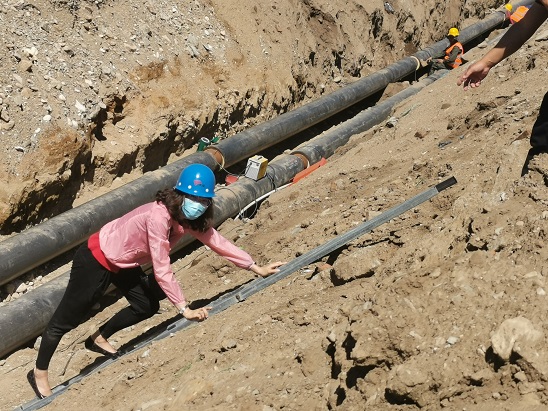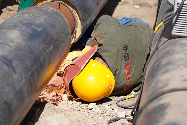 筆者帶好安全帽,也順著工人們下溝的唯一路徑----一個(gè)近乎垂直立在溝邊梯子下到溝里,每走一步,周?chē)耐辆驮?quot;簌簌"的往下掉,筆者的心也跟著這些土渣心驚膽戰(zhàn)。來(lái)到管道溝里,兩根粗粗的管子并排向遠(yuǎn)方延伸去。管溝雖然深,但是并不寬,作業(yè)空間不大。