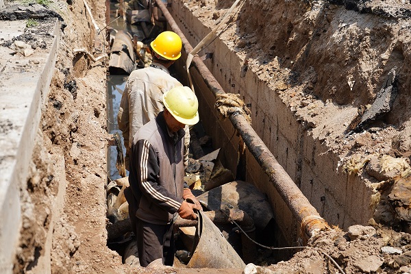 開天花園小區施工直播結束后,我們直播組直奔如意小區供熱二次管網改造的施工現場。循著一陣陣的臭味,我們來到了如意小區的A區一幼兒園后面,映入眼簾的是正在抽排污水的地溝,地溝中的供熱管線距污水水面非常近,污水在炎熱天氣的發酵下,臭氣熏天。工人們正在深溝里進行排污及淤泥清理工作,每一個動作都顯得格外艱難,衣服幾乎和污水一個顏色。