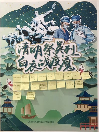黨支部還制作了祭奠海報,張貼在樓道醒目位置,黨員群眾可以隨時進行祭掃活動,并留下祭掃寄語,祭奠在中國革命、建設、改革歷史進程中英勇犧牲烈士的同時,致敬在抗擊疫情一線犧牲的醫護人員、公安干警等"逆行英雄"。