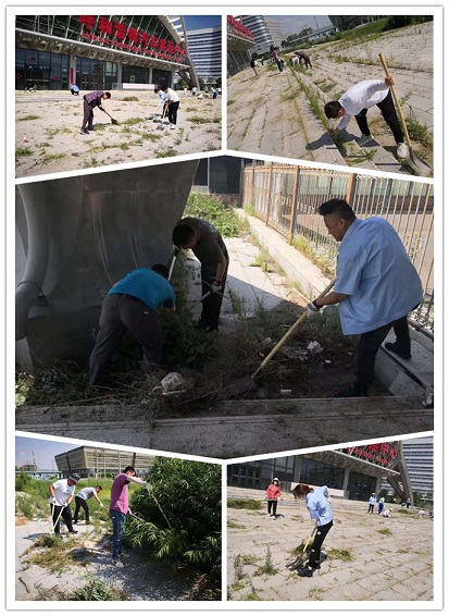 大家在黨員、干部的帶領下,熱情高漲,分工合作,用手中的鐮刀、鐵鍬、除草剪對廣場展開了地毯式清理。